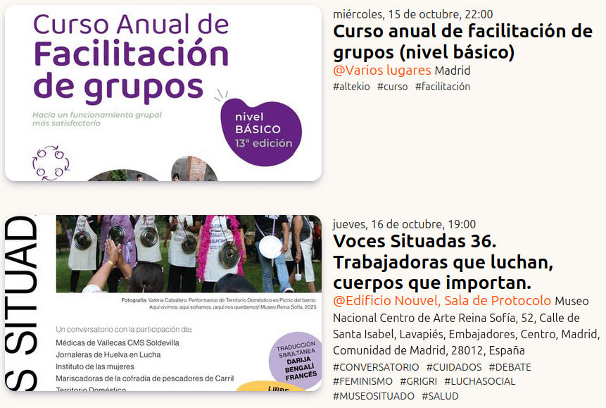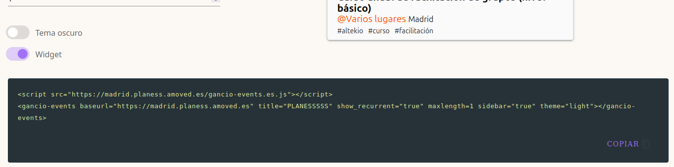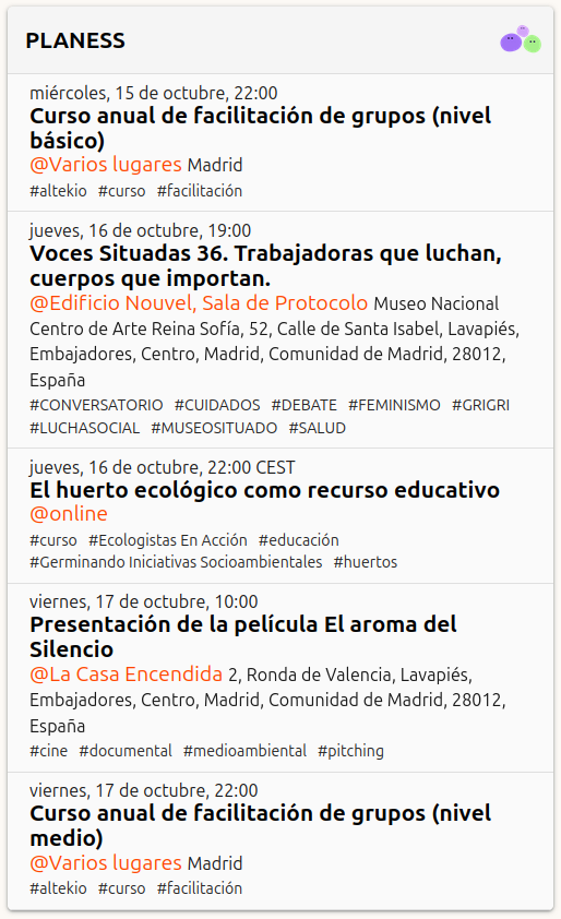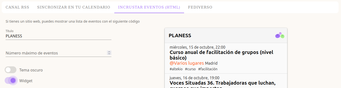 PlanESS, a través del software Gancio, te permite incrustar tanto el timeline completo de los eventos que hay en agenda así como un evento de forma individual
